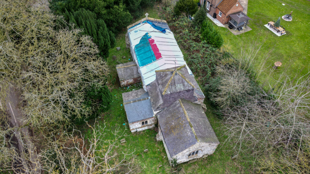 In December of 2024 – storms damaged the temporary roof that had been put on following the theft of the lead. Curtain sidings from commercial vehicles were used to replace the original plastic sheetings, which helped to keep out the weather.